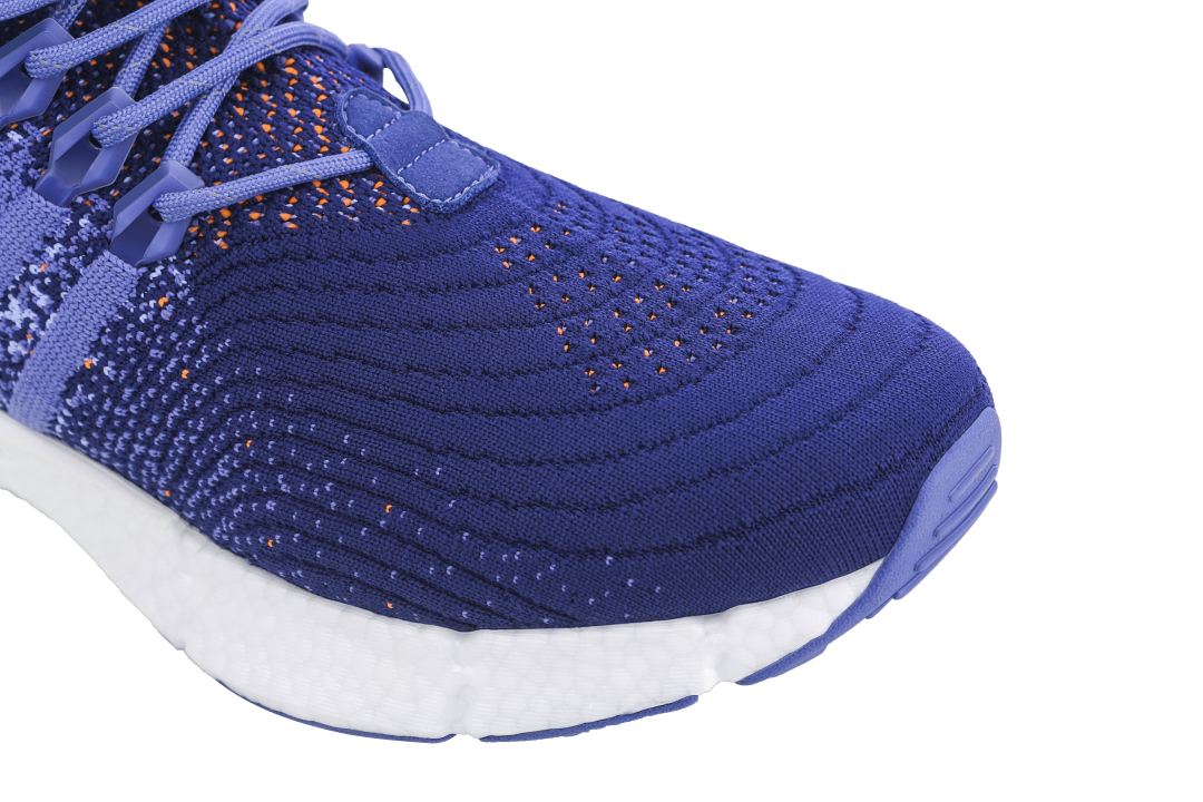 对品质的追求上这双鞋面的结构上最能体现。由于鞋头和鞋身的飞织结构是不一样的,鞋头是带曲线和立体感的结构,所以原本第一版样品鞋头和鞋身是两块飞织拼接而成的。这样虽然达到了我们想要的效果,但是影响了美观,而且有拼接的话也有卡脚的风险。历经3个月,我们与飞织厂一起研究怎么能够在一块布上织出我们想要的效果。一开始飞织厂觉得没有必要这样做,1是很难,几乎不可能,2是成本增加好多,拼接的话也可以拼的很好,不容易看出来。但是在我们精益求精的态度下,飞织厂被我们说服了,最终做出来我们理想的效果。